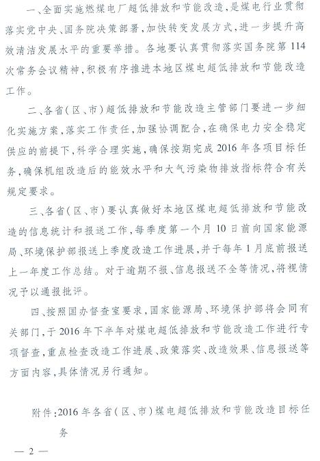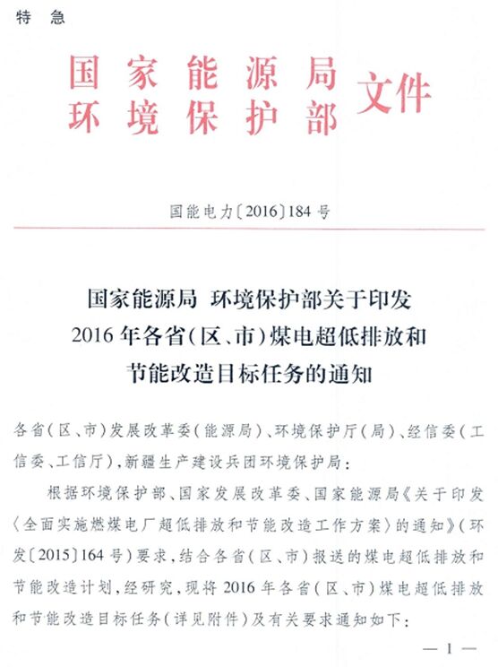 根据环境保护部、国家发展改革委、国家能源局《关于印发<全面实施燃煤电厂超低排放和节能改造工作方案>的通知》(环发〔2015〕164号)要求,结合各省(区、市)报送的煤电超低排放和节能改造计划,近日,国家能源局、环保部下发《关于印发2016年各省(区、市)煤电超低排放和节能改造目标任务的通知》(国能电力〔2016〕184号),通知明确了2016年各省(区、市)煤电超低排放和节能改造目标任务及有关要求,现将通知转发如下。